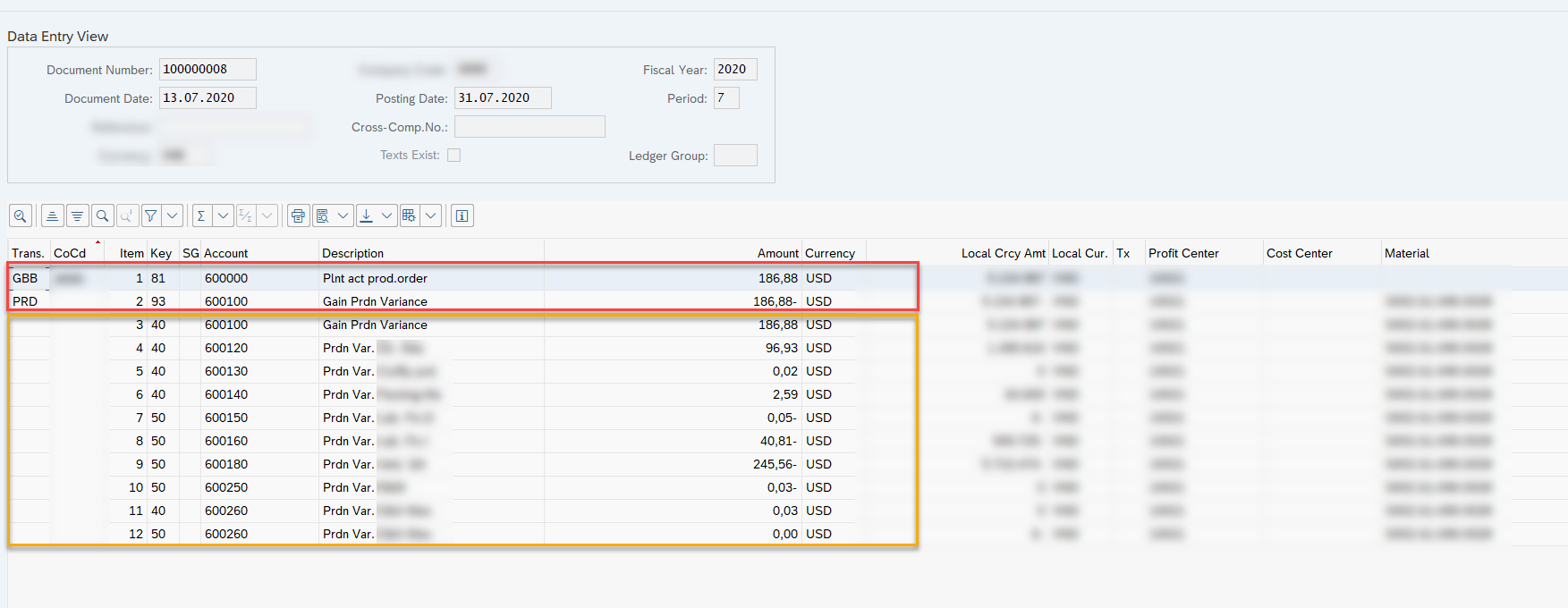 | (PRD) 600100 – Price Variances | 200 USD | |
