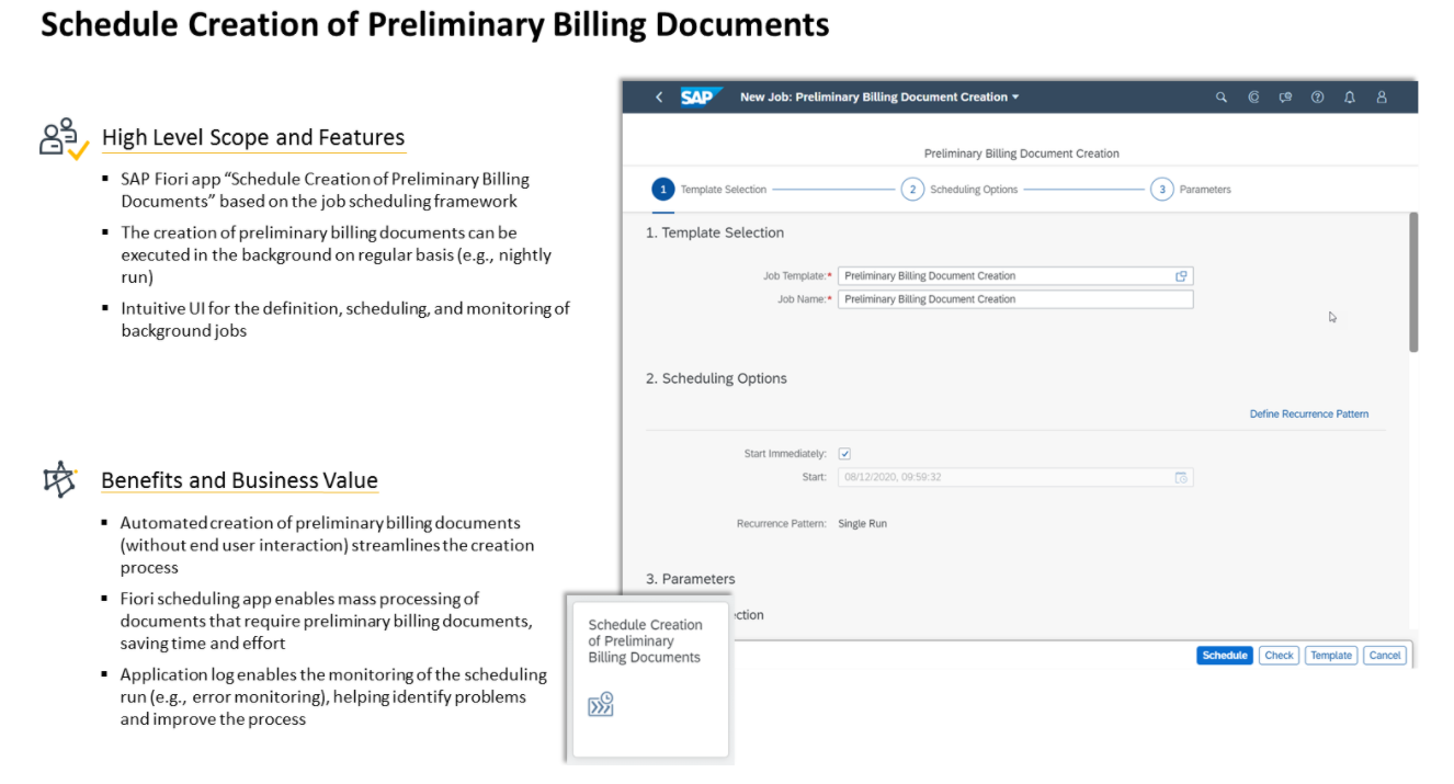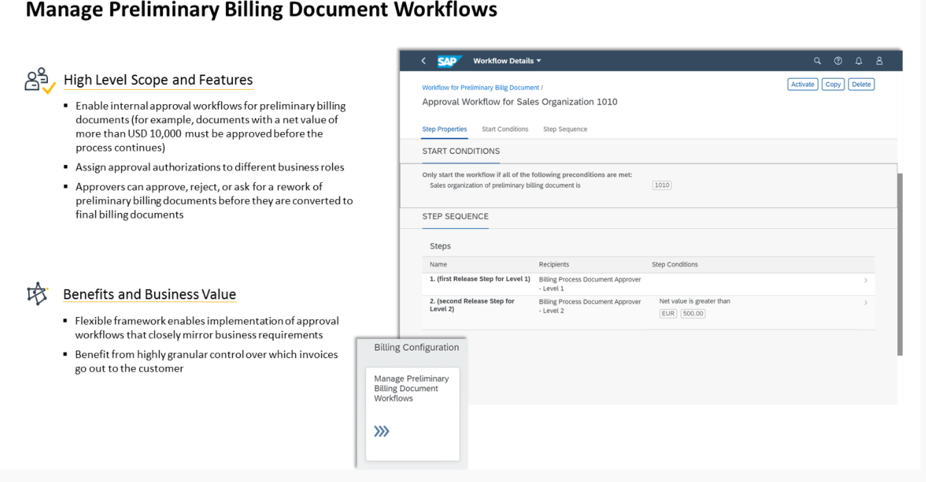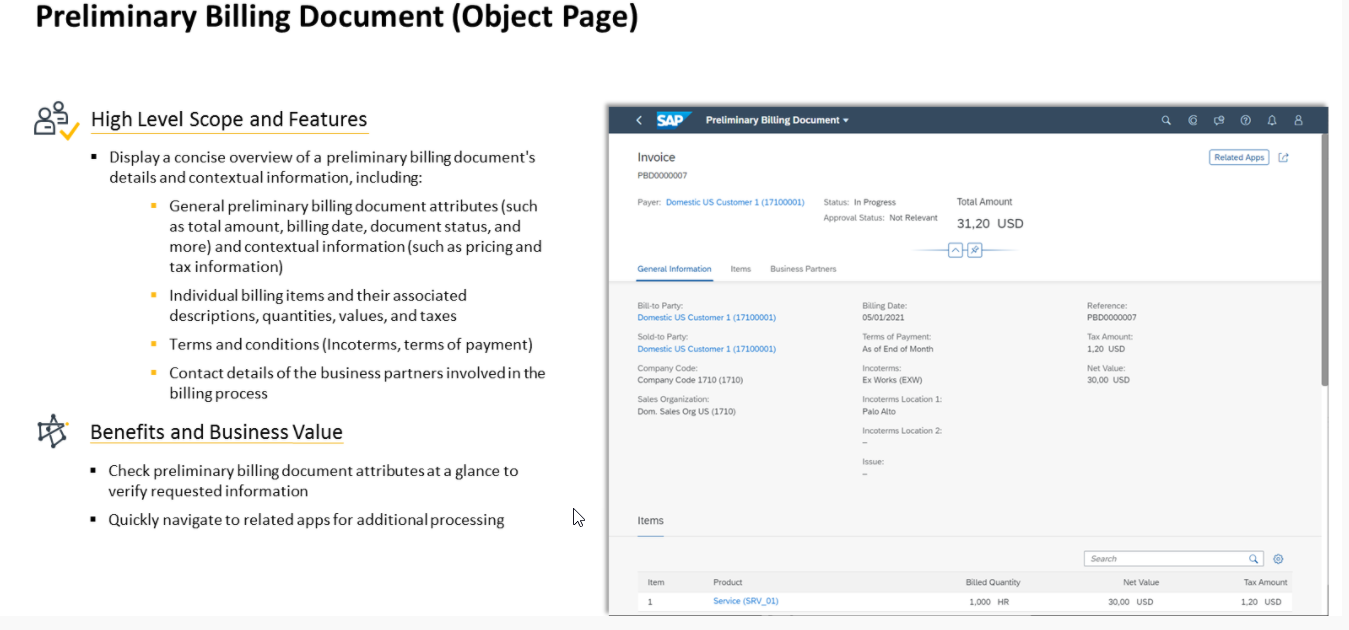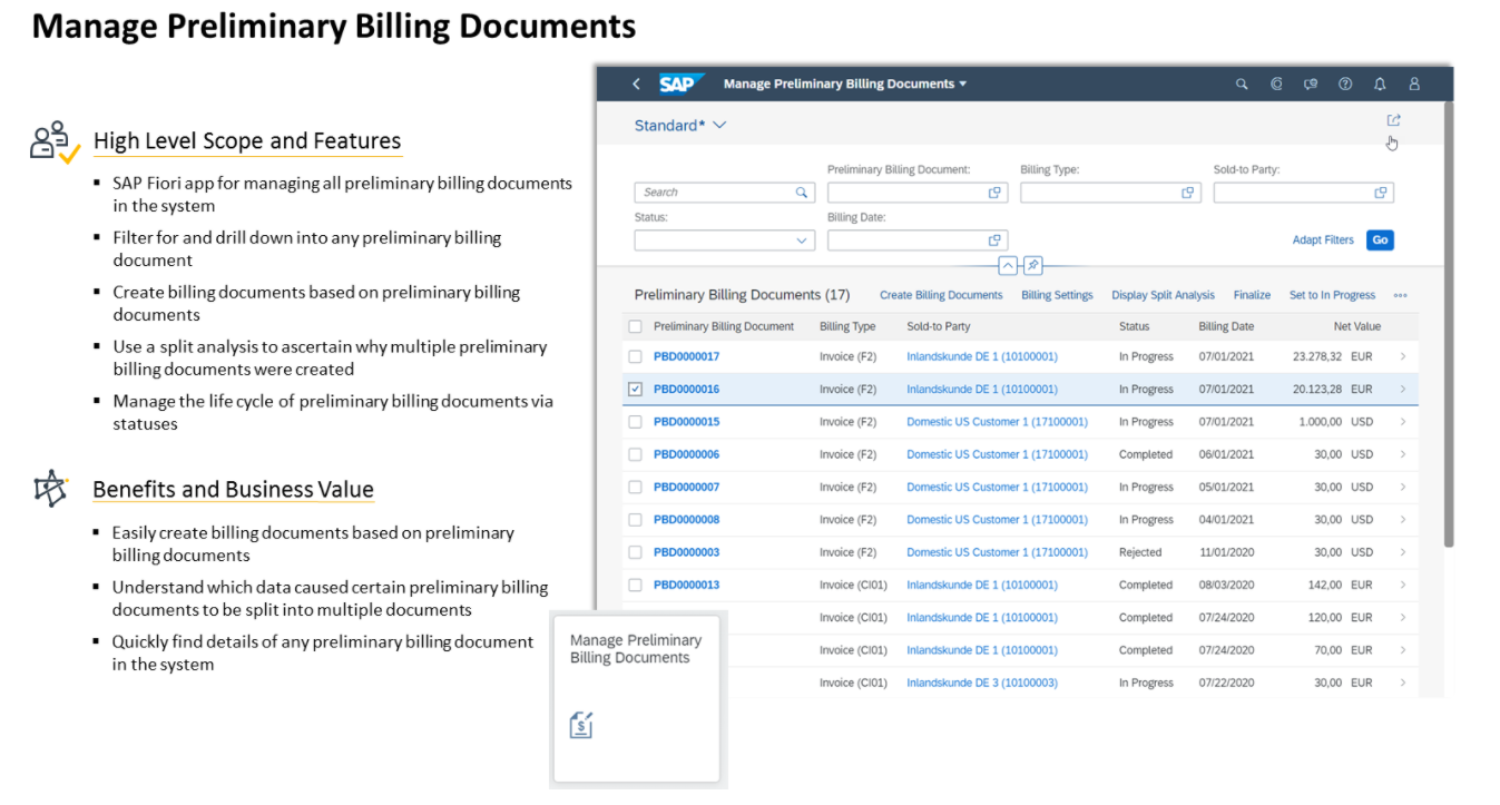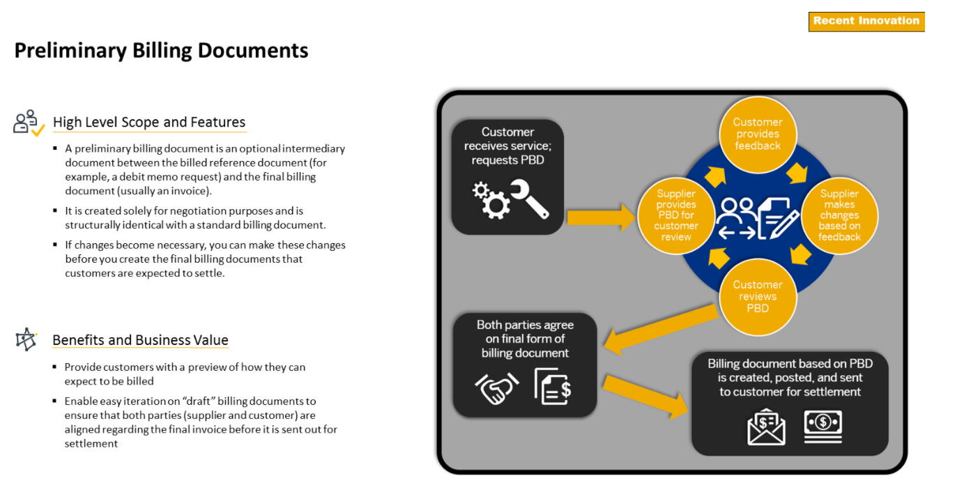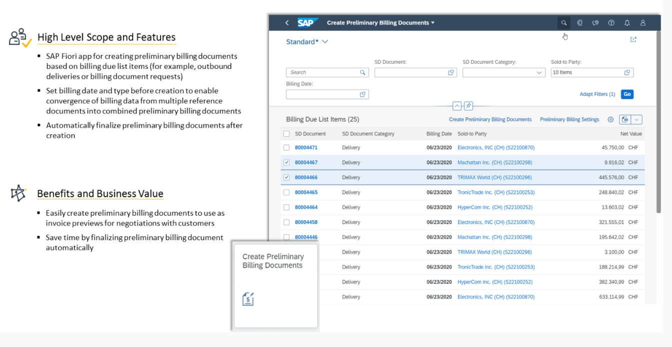 Preliminary billing documents for negotiation purposes based on items in the billing due list. You can change prices, attachment, and text for example. Output can be created for preliminary billing documents like final billing documents.