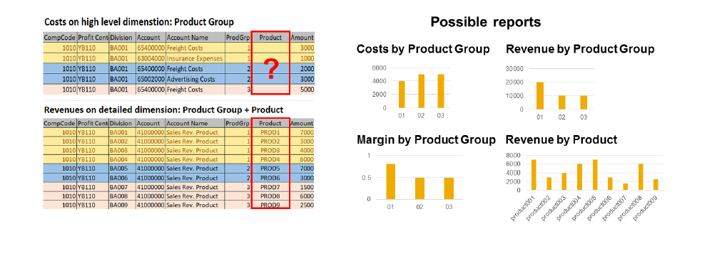 Data is not always posted and available on the lowest possible level. For example, revenue is posted on lowest level, but costs are not always available on that same level:
